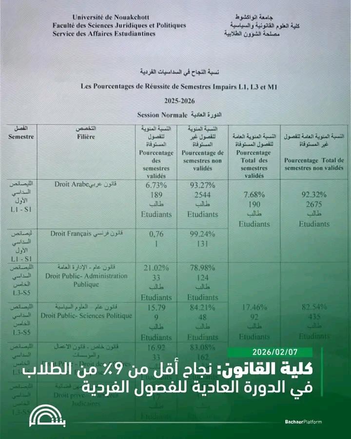 بكلية العلوم القانونية والسياسية في جامعة نواكشوط، أن نسبة النجاح في الدورة العادية من الفصول الفردية للعام الجامعي 2025–2026 لم تتجاوز 8.76٪ من مجموع الطلبة المسجلين.